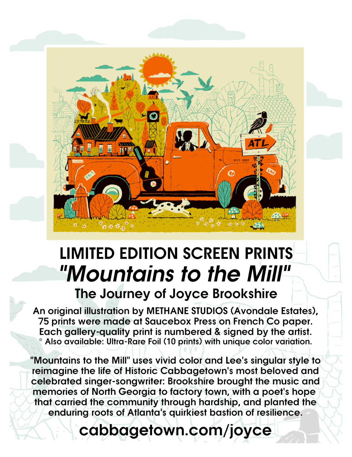 Handmade by Robert Lee of Methane Studios (Avondale), pressed by Sauce Box (Boulevard Heights) on French Company paper. Signed & numbered limited edition. Illustrating the journey from North Georgia to the Fulton Bag Mill, and how early residents survived by bringing their rural recipes, heritage skills, and traditional music to Atlanta. Proceeds benefit the Brookshire Memorial Amphitheatre.